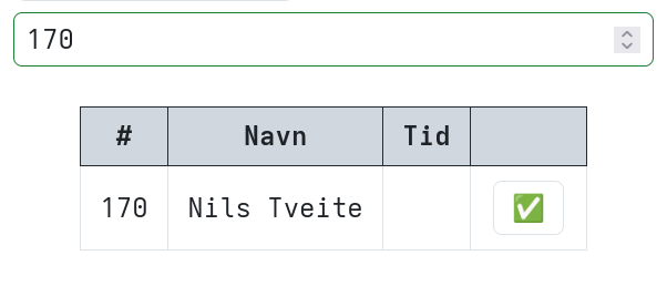 Når en løper skal registreres skriver du inn startnummeret. Løperens navn skal da dukke opp og du trykker på ✅️