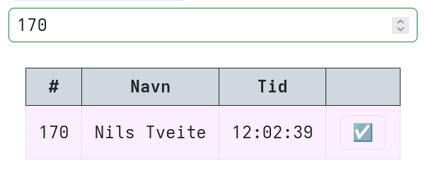 Når en løper skal registreres skriver du inn startnummeret. Løperens navn skal da dukke opp og du trykker på ✅️